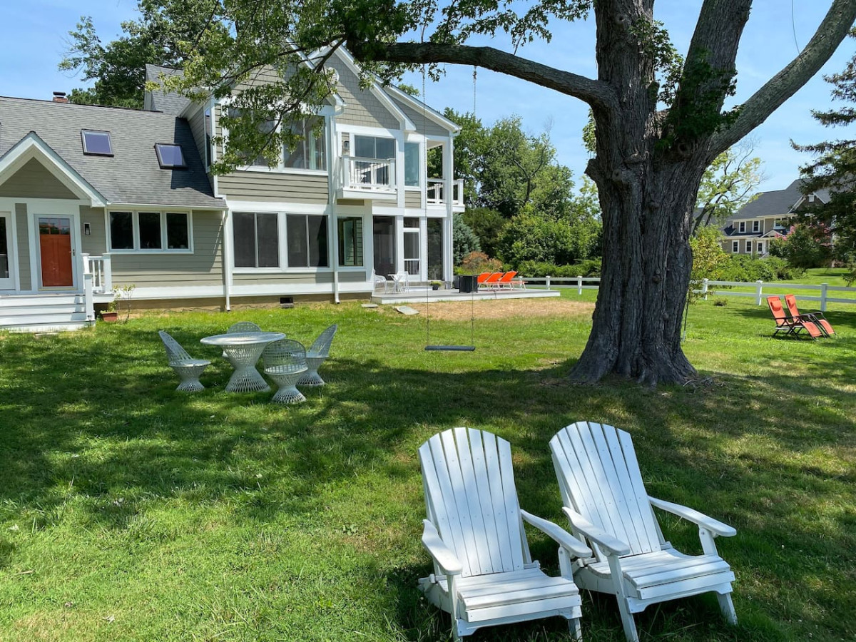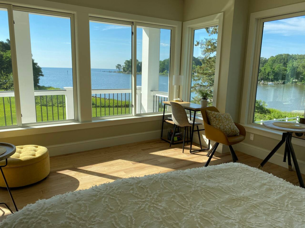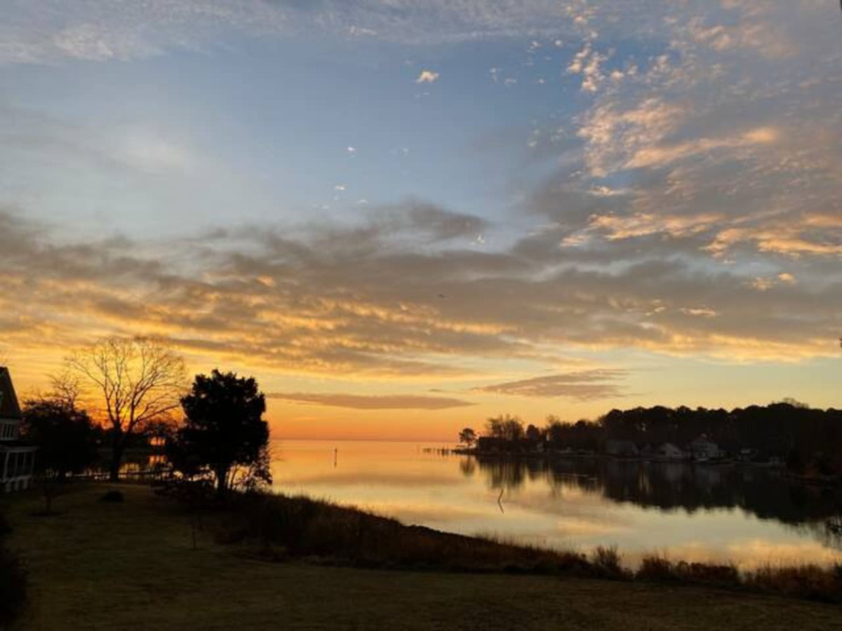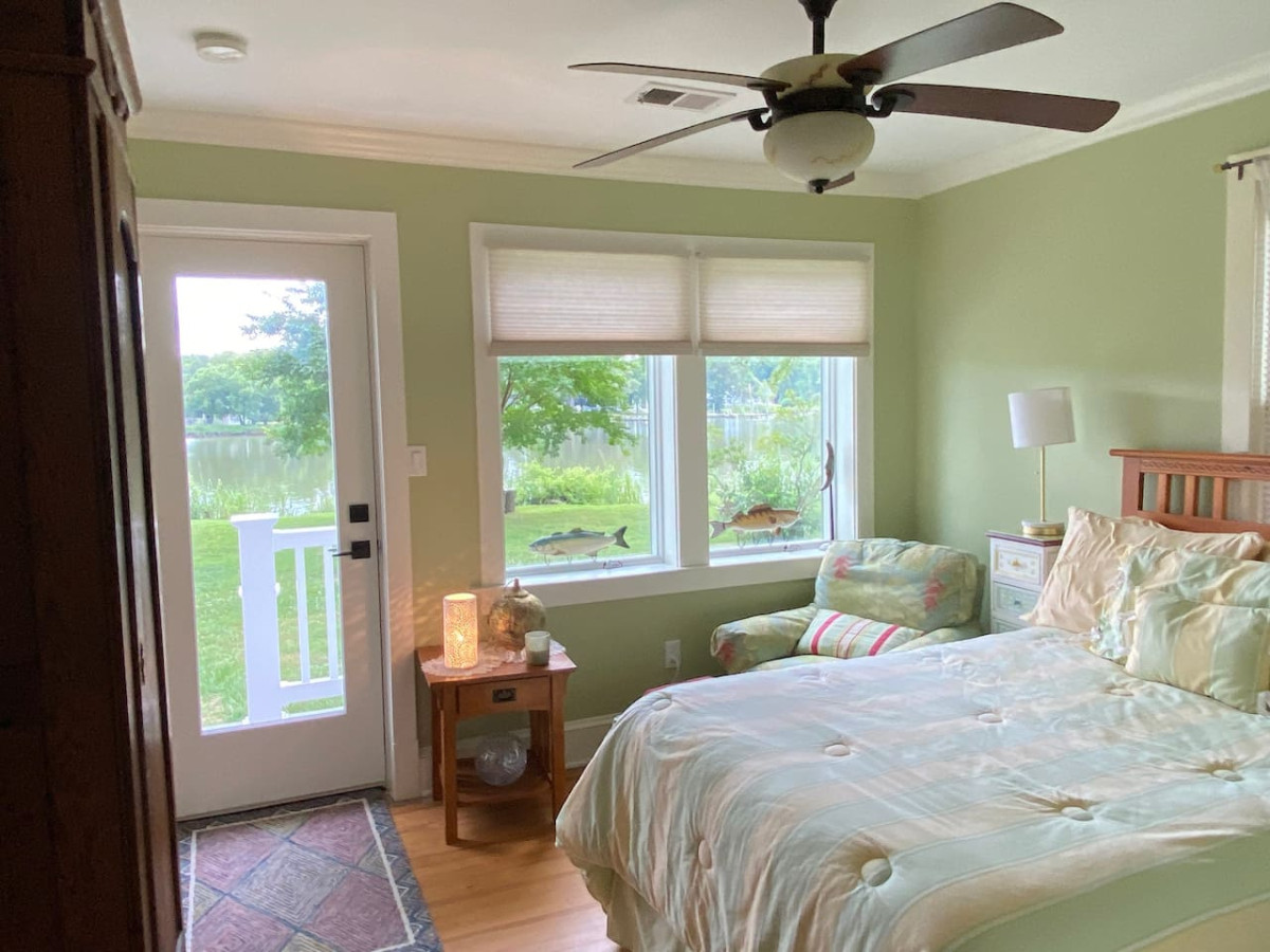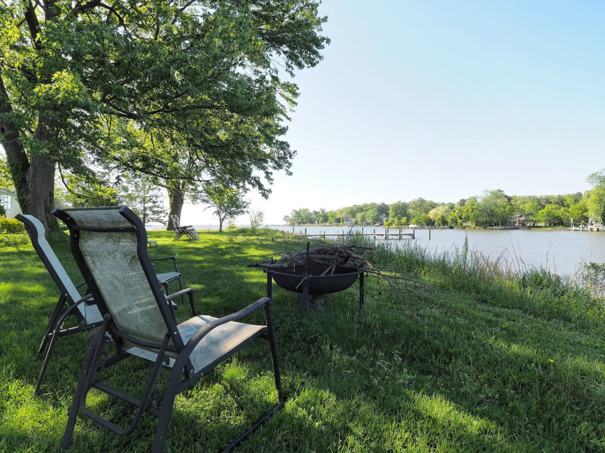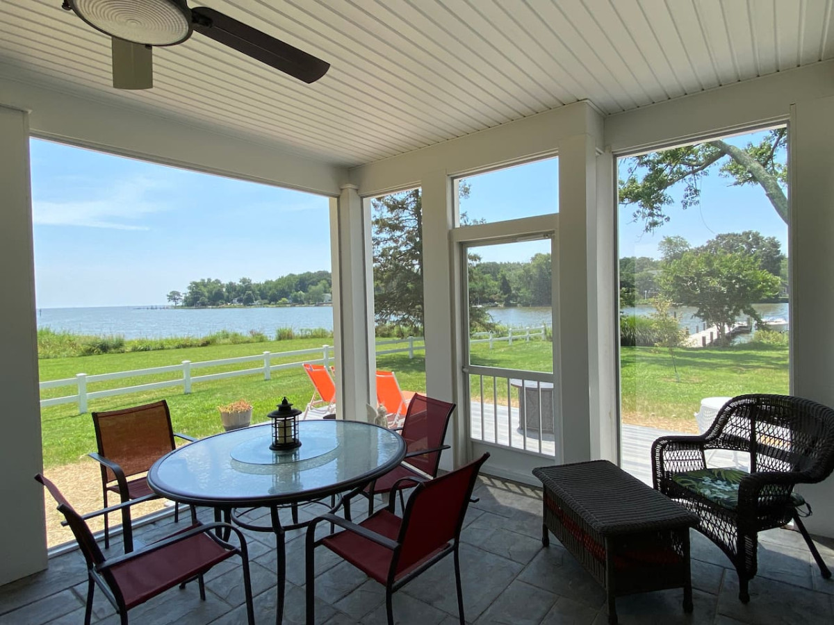 This is a fabulous 4-5 bedroom 3-ba House, affectionately called Porchlandia, with spectacular views on a lush, waterfront point! Shady waterfront lawns & sunny pier, breezy open spaces, sparkling views & wildlife, hidden but close to services. Couples & groups love our wonderful, nature-filled spot, a fun, relaxing, serene retreat on the WEST shore of the Chesapeake (close proximity to D.C., Annapolis, Baltimore)! Crabbing, kayaks, fire pit on two-acre country-like spot. Porchlandia is a slightly smaller, less expensive version of the whole house listing. This means the owner (or another individual/couple) could be in “The Flat Plus,” which is a completely separate upstairs apartment with its own entrance. IMPORTANT NOTE: This is an incredible rental for fairly quiet parties. While you have the whole house except for the separate two-room locked-off apartment upstairs, it is still all under the same roof, so renting it means you accept that you may (or may not) hear others in the house. You also agree to be sensitive about noise levels, esp. when in kitchen and bedrooms. (Living room/Morning Room are more separate.) Below is a more detailed description of the rooms and layout to help you see how we can accommodate your group. Raised Ground floor: - Bedroom 1: "Soft Swedish Carolina Light” (aka The Green Room), with a double bed, is the closest bedroom to the water, has two waterfront windows and a glass door leading out to the water. Bathroom is two steps outside your door. - Bedroom 2: “Sweet Memories of Changzhou" (aka Jamie's Room), has a side window water view and a double bed, with the same shared bath two steps outside your door, making this & Soft Swedish Carolina Light a good option for people who want two bedrooms close together. - Bedroom 3: "Dot's Room" (aka The Mudroom) is smaller and has a twin bed with a pull-out twin mattress underneath. Designed as a mudroom, it has its own separate French door entrance and also houses a washer and dryer in its closet. It can share the same bath at the end of the hall or, alternately, the Mermaid Bath at the top of the steps. - Study/Optional "Bedroom 4," "The Morning Room," (a glass study off the foyer that can be converted to a bedroom), is a calm, beautiful space with a bar-height glass table and glass coffee table for relaxing in the morning sun or any time, three walls of windows for an intimate view of both creek and bay, a queen-sized sleeper sofa, and a view of the double-sided fireplace in the foyer. It also has a sliding glass door onto the screened porch that could be left open for those who like a natural sleeping space with cricket or bird songs. In the near future (supply chain issues) it will have French doors with cross-reed glass that can be closed off for greater privacy. - An L-shaped Italian leather couch in the Great Room provides a comfortable extra sleeping space. We provide bedding (please let us know in advance if you'd like to use it). - A small, but full, marble tile bathroom accommodates the downstairs. - A fully-equipped "CREEK VIEW" kitchen has leathered granite countertops, bar-height stools, and all the many of the spices, etc., you'll need. - The Great Room has 9' ceilings and a 16-foot sliding glass door that opens onto the screened porch, making it into a LANAI and almost doubling the size of the living room. This same porch opens onto the Morning Room as well, so a very large, fluid space can be created for gatherings. - The gas fireplace in the Great Room is double-sided so it can be viewed also from the Morning Room or from the entry foyer, and has remote control for five levels of flame and heat. The 50" state-of-the-art TV above it is directly wired into the internet (no dependence on WiFi) and there are also speakers for bluetooth-controlled music. - The dining room part of the Great Room has a large Bay view dining table for formal dining, as well as swivel chairs for casual snacks on the water. The sliding doors and windows on both sides can give the feeling of being outside while still indoor and close to the kitchen. The sliding doors also go directly onto the deck making BBQing and outdoor dining easy. --Sliding glass door opens from the living room onto a state-of-the-art screened porch created out of white pillars with expansive, transparent screens. The porch, which has a full couch, gas firepit, rocking and dining chairs/table leads out to the deck while also opening, via glass slider, to the Morning Room. The upstairs configuration: - Bedroom 5: "The Sunrise Suite" Master Bedroom has a queen-sized bed, windows galore, a wet-bar kitchen, built in remote-controlled electric wall fireplace and TV, Bluetooth speakers, sitting area, and dining area, as well as outdoor lounging/dining on its balcony. It is adorned with a huge master bath with a "retro" natural teak vanity, large rain shower (w jets, bench, and grab bars) and a roomy 68” ivory soaking tub and toilet with spectacular corner-window views of the Bay (best "toilet view" ever!). - The smaller "Mermaid Bathroom" in the hallway has a “step down” shower and is a common bath that creates a second option to accommodate downstairs guests. While the downstairs will be very clean, some of the owner's private possessions will be present since this is also her private residence for certain times of the year. So far, folks have loved this space and were happy to agree to this special situation. :-) We provide helpful amenities for all seasons like throw blankets for movie nights, extra towels, big floaty things for playing off the pier in summer, and other small touches that can make all the difference in creating your happy, memorable experience. You'll enjoy gorgeous views from the screened porch, decks, and upscale sliding glass windows and doors galore....take in the moon and stars, both sunrise and sunset views, and sparkling water, especially dazzling in fall and winter. Enjoy the gas bbq, firepit, tree swings, double hammo