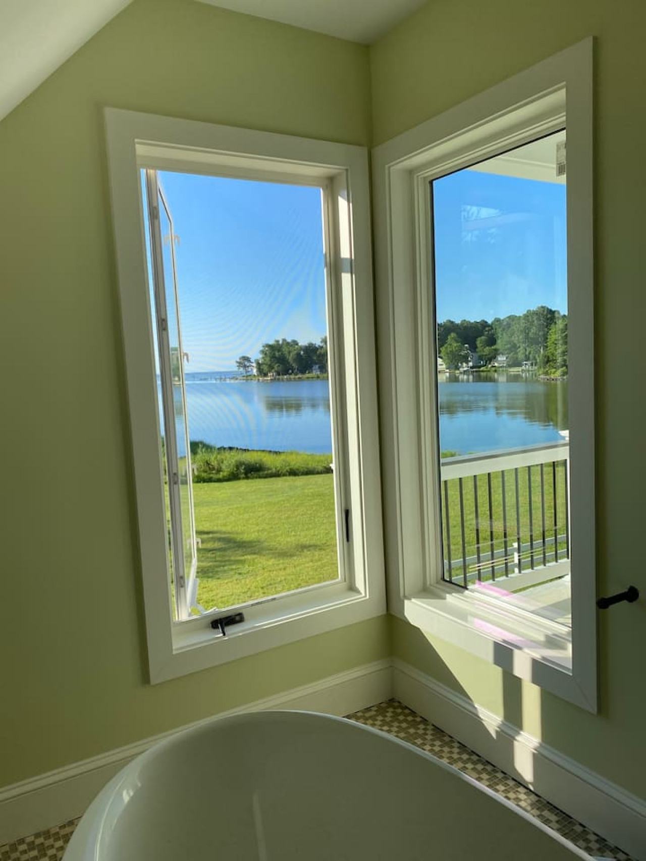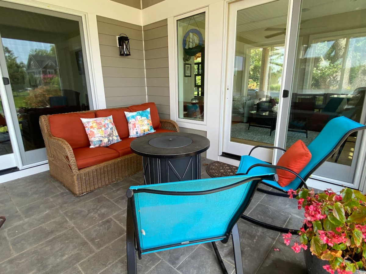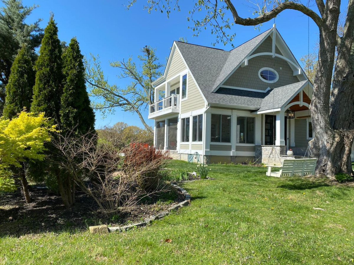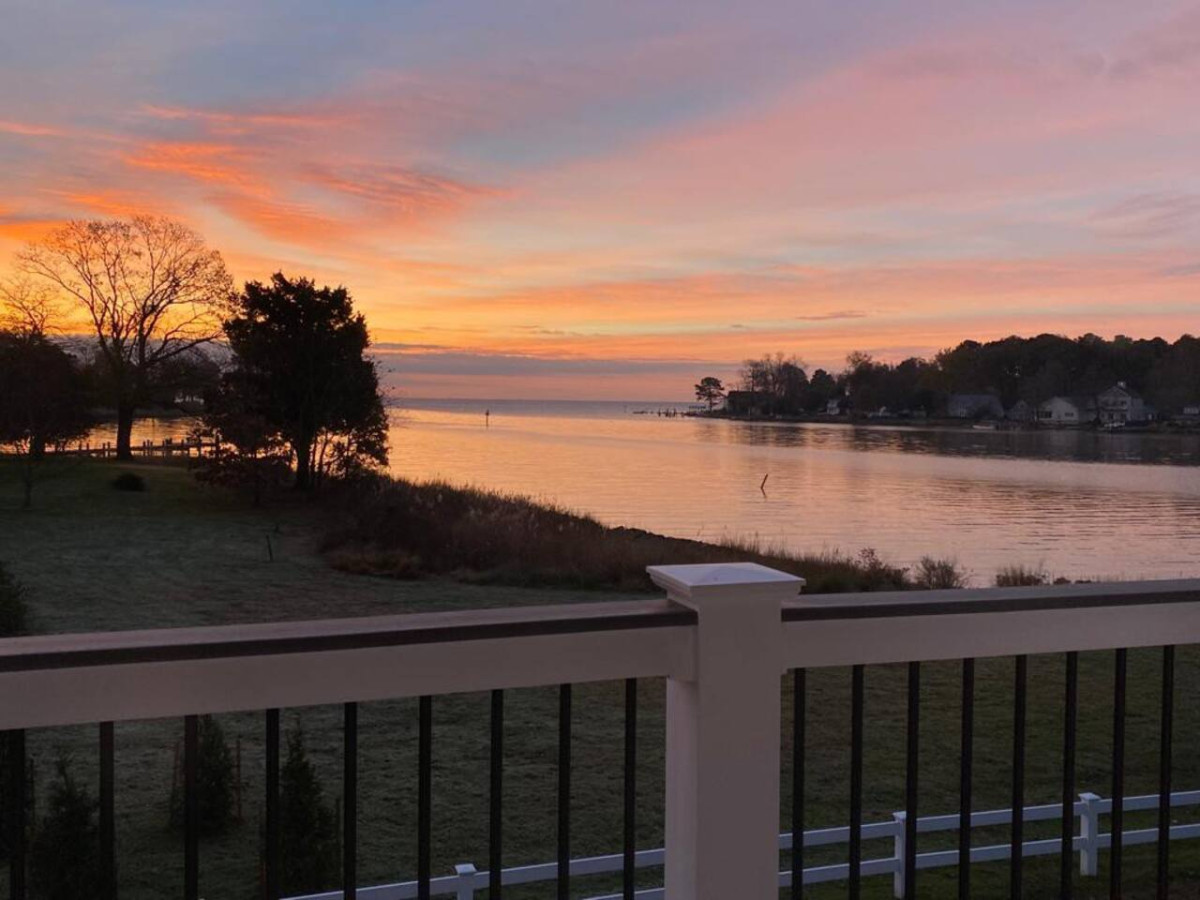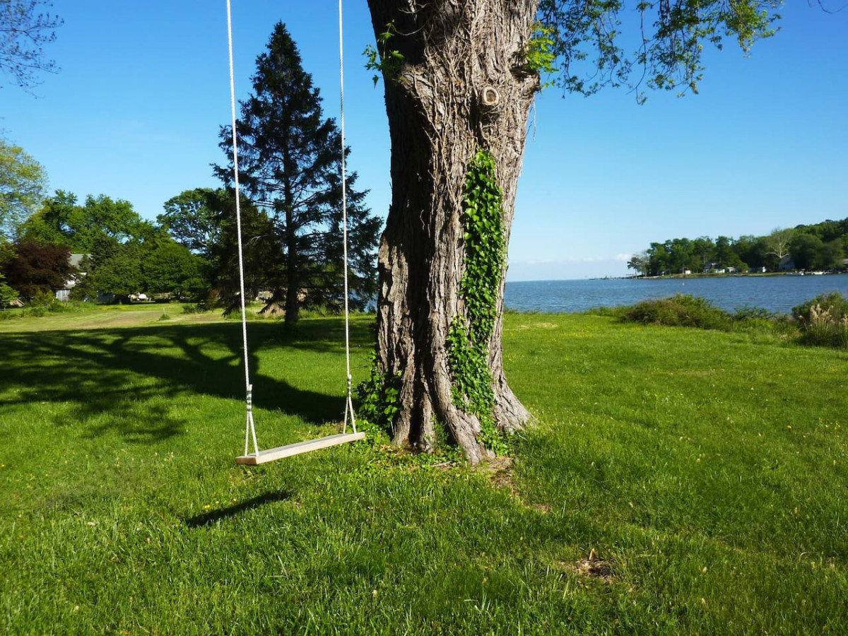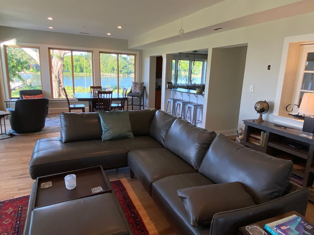 This is a fabulous 4-5 bedroom 3-ba House, affectionately called Porchlandia, with spectacular views on a lush, waterfront point! Shady waterfront lawns & sunny pier, breezy open spaces, sparkling views & wildlife, hidden but close to services. Couples & groups love our wonderful, nature-filled spot, a fun, relaxing, serene retreat on the WEST shore of the Chesapeake (close proximity to D.C., Annapolis, Baltimore)! Crabbing, kayaks, fire pit on two-acre country-like spot. Porchlandia is a slightly smaller, less expensive version of the whole house listing. This means the owner (or another individual/couple) could be in “The Flat Plus,” which is a completely separate upstairs apartment with its own entrance. IMPORTANT NOTE: This is an incredible rental for fairly quiet parties. While you have the whole house except for the separate two-room locked-off apartment upstairs, it is still all under the same roof, so renting it means you accept that you may (or may not) hear others in the house. You also agree to be sensitive about noise levels, esp. when in kitchen and bedrooms. (Living room/Morning Room are more separate.) Below is a more detailed description of the rooms and layout to help you see how we can accommodate your group. Raised Ground floor: - Bedroom 1: "Soft Swedish Carolina Light” (aka The Green Room), with a double bed, is the closest bedroom to the water, has two waterfront windows and a glass door leading out to the water. Bathroom is two steps outside your door. - Bedroom 2: “Sweet Memories of Changzhou" (aka Jamie's Room), has a side window water view and a double bed, with the same shared bath two steps outside your door, making this & Soft Swedish Carolina Light a good option for people who want two bedrooms close together. - Bedroom 3: "Dot's Room" (aka The Mudroom) is smaller and has a twin bed with a pull-out twin mattress underneath. Designed as a mudroom, it has its own separate French door entrance and also houses a washer and dryer in its closet. It can share the same bath at the end of the hall or, alternately, the Mermaid Bath at the top of the steps. - Study/Optional "Bedroom 4," "The Morning Room," (a glass study off the foyer that can be converted to a bedroom), is a calm, beautiful space with a bar-height glass table and glass coffee table for relaxing in the morning sun or any time, three walls of windows for an intimate view of both creek and bay, a queen-sized sleeper sofa, and a view of the double-sided fireplace in the foyer. It also has a sliding glass door onto the screened porch that could be left open for those who like a natural sleeping space with cricket or bird songs. In the near future (supply chain issues) it will have French doors with cross-reed glass that can be closed off for greater privacy. - An L-shaped Italian leather couch in the Great Room provides a comfortable extra sleeping space. We provide bedding (please let us know in advance if you'd like to use it). - A small, but full, marble tile bathroom accommodates the downstairs. - A fully-equipped "CREEK VIEW" kitchen has leathered granite countertops, bar-height stools, and all the many of the spices, etc., you'll need. - The Great Room has 9' ceilings and a 16-foot sliding glass door that opens onto the screened porch, making it into a LANAI and almost doubling the size of the living room. This same porch opens onto the Morning Room as well, so a very large, fluid space can be created for gatherings. - The gas fireplace in the Great Room is double-sided so it can be viewed also from the Morning Room or from the entry foyer, and has remote control for five levels of flame and heat. The 50" state-of-the-art TV above it is directly wired into the internet (no dependence on WiFi) and there are also speakers for bluetooth-controlled music. - The dining room part of the Great Room has a large Bay view dining table for formal dining, as well as swivel chairs for casual snacks on the water. The sliding doors and windows on both sides can give the feeling of being outside while still indoor and close to the kitchen. The sliding doors also go directly onto the deck making BBQing and outdoor dining easy. --Sliding glass door opens from the living room onto a state-of-the-art screened porch created out of white pillars with expansive, transparent screens. The porch, which has a full couch, gas firepit, rocking and dining chairs/table leads out to the deck while also opening, via glass slider, to the Morning Room. The upstairs configuration: - Bedroom 5: "The Sunrise Suite" Master Bedroom has a queen-sized bed, windows galore, a wet-bar kitchen, built in remote-controlled electric wall fireplace and TV, Bluetooth speakers, sitting area, and dining area, as well as outdoor lounging/dining on its balcony. It is adorned with a huge master bath with a "retro" natural teak vanity, large rain shower (w jets, bench, and grab bars) and a roomy 68” ivory soaking tub and toilet with spectacular corner-window views of the Bay (best "toilet view" ever!). - The smaller "Mermaid Bathroom" in the hallway has a “step down” shower and is a common bath that creates a second option to accommodate downstairs guests. While the downstairs will be very clean, some of the owner's private possessions will be present since this is also her private residence for certain times of the year. So far, folks have loved this space and were happy to agree to this special situation. :-) We provide helpful amenities for all seasons like throw blankets for movie nights, extra towels, big floaty things for playing off the pier in summer, and other small touches that can make all the difference in creating your happy, memorable experience. You'll enjoy gorgeous views from the screened porch, decks, and upscale sliding glass windows and doors galore....take in the moon and stars, both sunrise and sunset views, and sparkling water, especially dazzling in fall and winter. Enjoy the gas bbq, firepit, tree swings, double hammo